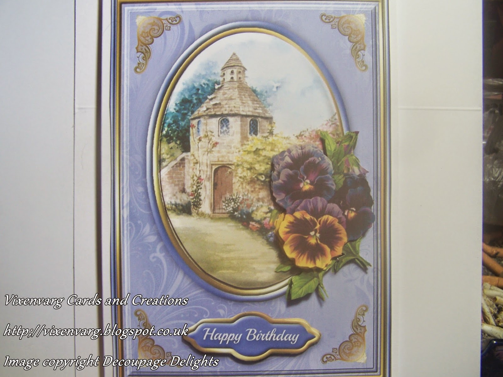 The card for today is a complete card design from the Floral Delights cdrom by Decoupage Delights.Every thing prints out and you can decoupage it as much as you like. The good thing is that you can alter the layers depending on whether you want to post it or not. So many times these days you have to be aware of the postage that you want to pay. I love this card because of the pansies. My Grandmother was a great fan of pansies and always grew them in her flower garden. At different times of the year I can remember her waiting for the first snowdrops,..smiling when the daffodils came out..gently touching the petals on the pansies and loving the colours on the sweetpeas. So many memories are involved with different flowers. Henry always bought me one of the first bluebells and every year I can sit in my chair and watch the mountains turn that blue purple as the bluebells come into bloom. I have a rosebush in my garden that continues to thrive despite me not knowing what to do with it. It has bloomed every year for the past 25 years..it has a lovely shade of pink and I get to see it every year from my window. There is also a buddlia which was only a few inches high when I planted it and it is now over 10 foot high. Such small pleasures that touch our lives.